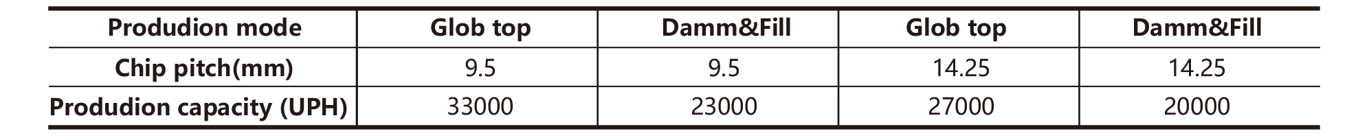 • Glob Top:33000UPH Damm & Fill:23000UPH |